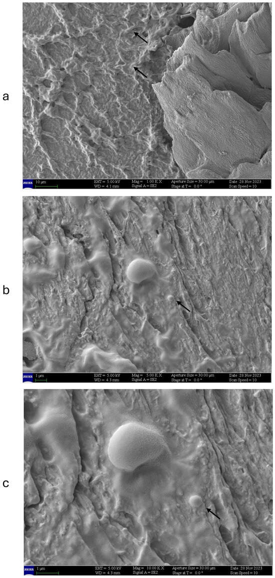 With one daily application of EXlor, at 1000× magnification, the nail surface appears severely damaged: the physiological keratin structural organization is lost, and the presence of T. rubrum is rare and almost undetectable (Figure 7a, black arrows). At higher magnification (Figure 7b, 5000×), the presence of amorphous formations, attributable to the fungal spores (as observed in control colonized series CNA, Figure 5b), is visible (Figure 7b, black arrow). At the highest magnification (Figure 7c), the opacification of the structures under observation is visible, probably due to the residual deposit of the administered product on the spore. Nevertheless, the image magnification appears reduced compared to the control sample (black arrows).