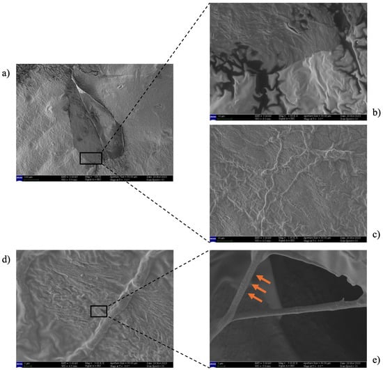 Figure 8. SEM acquisition showing the growth of hyphal network that is covered with the bovine nail receiving 1×/day application of Poderm Purifying. Acquisitions were obtained at several magnifications: (a) at 100×, (b,c) at 1000× (d) at 5000×, and (e) at 10,000×. Orange arrows show damaged nail keratin fibers.