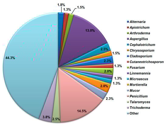 - Júnior, D.P.L.; Yamamoto, A.C.A.; de Souza Amadio, J.V.R.; Martins, E.R.; do Santos, F.A.L.; Simoes, S.D.A.A.; Hahn, R.C. Trichocomaceae: Biodiversity of Aspergillus spp. and Penicillium spp. Residing in Libraries. J. Infect. Dev. Ctries. 2012, 6, 734–743. [Google Scholar] [CrossRef]