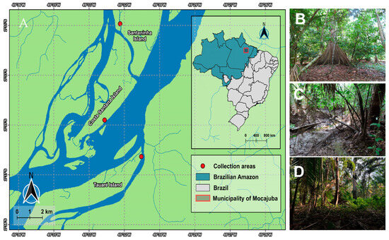 (A) Map of the studied region of the municipality of Mocajuba. (B) Costa Santana Island; (C) Santaninha Island; (D) Tauré Island.