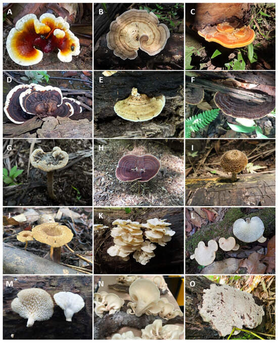 Macrofungi from the flood forests studied in Brazilian Amazon: (A) Ganoderma stipitatum, (B) Trametes elegans, (C) Rigidoporus ulmarium, (D) Earliella scabrosa, (E) Flaviporus liebmannii, (F) Cerrena caperata, (G) Foraminispora rugosa, (H) Amauroderma exile, (I) Lentinus swartzii, (J) Lentinus sp., (K) Lentinus concavus, (L) Favolus trigonus, (M) Favolus tenuiculus, (N) Pleurotus djamor, (O) Truncospora tephropora.
