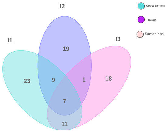 According to the composition of the species recorded on the islands, 23 were exclusively observed in Costa Santana, 18 in Santaninha, and 19 species in Tauaré. In turn, the three islands share seven species between them. The number of species shared between Costa Santana/Santaninha was equal to 11 and Costa Santana/Tauaré was equal to 9. Interestingly, Santaninha presented only one species associated with Tauaré, but shared nine of them with Costa Santana (Figure 3).