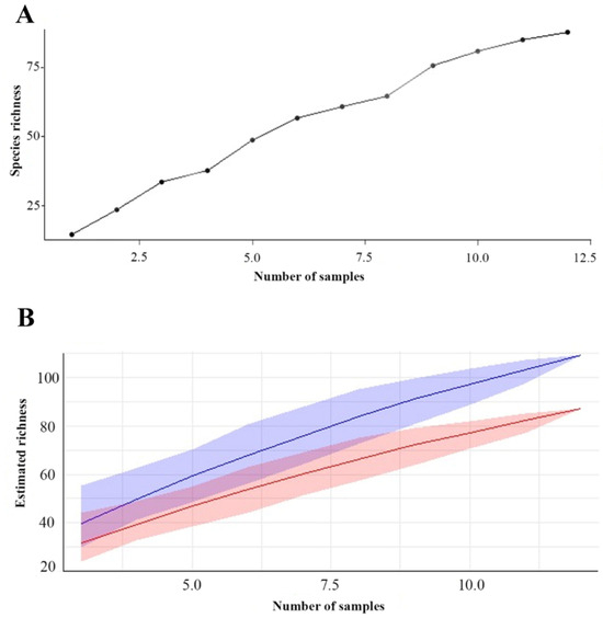 Dynamic accumulation: (A) Species accumulation curve in the three islands of floodplain forest. (B) Bootstrap chart. The red line represents the richness estimate calculated using bootstrap, while the blue line represents the observed or estimated richness directly from the data. The shaded area indicates the confidence interval.