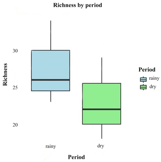 There was no significant difference between the rainy season (June 2022 and 2023) and dry season (November 2022 and 2023) in relation to species richness (F = 1.032; p = 0.367). Although the means indicate that wealth is higher in the rainy season (mean = 27.7, standard deviation (SD) = 5.69) compared to the dry season (mean = 23.0, standard deviation (SD) = 5.57), the ANOVA indicated that this difference is not statistically significant (Figure 6).