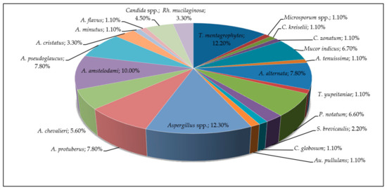During the initial isolation of pathogens from 543 samples of biological material from domestic and wild animals in Northern Kazakhstan, conducted between 2012 and 2022, the predominant micromycetes were opportunistic mold fungi (50.2%), including Mucor spp., Penicillium spp., Aspergillus spp., Alternaria spp., Chaetomium spp., Eurotium spp., Phoma spp., Trichoderma spp., Lecanicillium psalliotae, Scopulariopsis brevicaulis, and others. Dermatophytes of the genera Trichophyton spp. and Microsporum spp. were detected in only 17.1% of cases. Yeasts of the genera Candida spp., Rhodotorula spp., and Exophiala spp. were isolated in only 5.1% of cases. In 27.6% of cases, no growth of micromycetes was observed in the biomaterial samples, or bacterial growth was noted. In the regions of Northern Kazakhstan and Western Siberia in Russia, a shift toward an increase in the number of opportunistic microorganisms was observed. Of the total number of identified micromycetes, 23.6% were classic causative agents of dermatomycosis, 69.3% were opportunistic causative agents of mold mycoses, and 7% were causative agents of yeast mycoses [97,98]. Our data are consistent with those of other researchers who have reported an increase in the proportion of opportunistic pathogens worldwide [2,7,13,14,15,16,17,18,19,20,21,99,100,101,102].