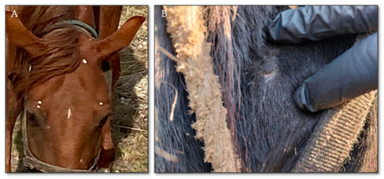 Appearance of skin lesions in horses with mycosis caused by Chrysosporium spp.: (A) lesions on the horse’s head, (B) scaling lesions.