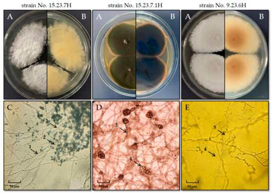 External appearance of colonies from pure cultures isolated from horse biomaterial on the 15th day of cultivation: (A)—front view and (B)—rear view of the colony; (С)—microscopic analysis of strain 15.23.7H; (D)—features of the microscopic structure of strain 15.23.7.1H; (E)—features of the mycelium structure of strain 9.23.6H; smooth mycelium (1), cluster-shaped microconidia (2), septate mycelium (3), macroconidia (4), microconidia (5).