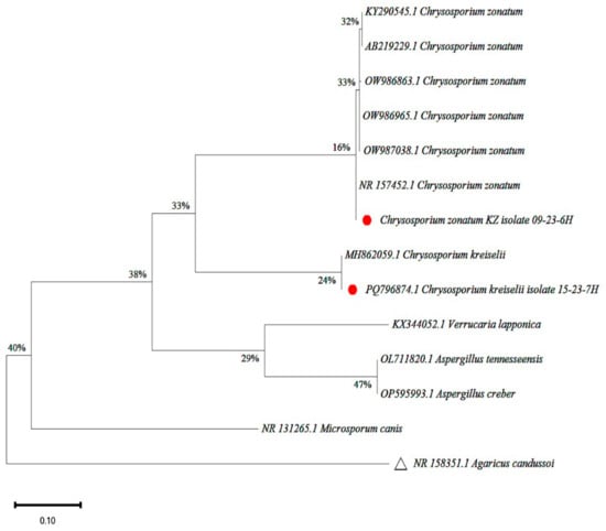The obtained sequence was analyzed using BLAST (Stable release 2.16.0+[1], 25 June 2024) with the NCBI database, which revealed 98.9% identity in both cases with the sequences of C. kreiselii and C. zonatum. Phylogenetic analysis was performed on the obtained data for the Chrysosporium strains. The final dataset contained 1898 positions. Two isolates from this study (marked with red circles), designated as C. zonatum isolate KZ 09-23-6H and C. kreiselii isolate 15-23-7H, grouped with their respective reference species (C. zonatum and C. kreiselii), confirming their taxonomic placement. Agaricus candussol (NR 158351.1) served as an outgroup species, providing evolutionary context. Other fungal species also formed a separate clade with their related sequences. Low node support is evident, indicating a moderate but weak level of clustering. The phylogenetic tree of species evolution, constructed using the maximum likelihood algorithm, is presented in Figure 4.