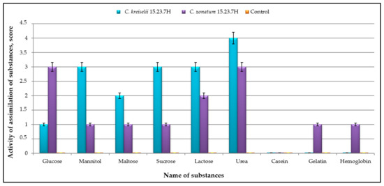 To confirm the pathogenicity of potential opportunistic strains, enzymatic activity, including activity against keratin, was assessed. Analysis of the enzymatic activity of C. kreiselii strain No. 15.23.7H and C. zonatum strain No. 9.23.6H, isolated from horse biomaterial samples, revealed that both isolates were capable of breaking down glucose, mannitol, maltose, sucrose, lactose, and urea. C. kreiselii No. 15.23.7H showed higher saccharolytic activity, though it was inferior to C. zonatum No. 9.23.6H only in glucose degradation. Proteolytic enzyme activity toward gelatin and hemoglobin was observed in C. zonatum No. 9.23.6H. Neither strain broke down milk casein (Figure 5).