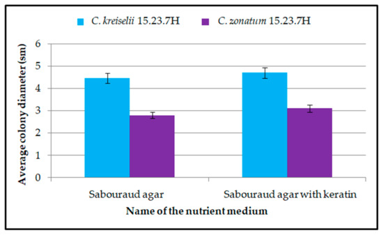 As shown in Figure 6, colonies of Chrysosporium spp. strains on nutrient dextrose Sabouraud agar enriched with keratin had a larger diameter compared to colonies growing on regular Sabouraud agar, which served as the control. This result indicates the presence of keratinophilic properties in C. kreiselii No. 15.23.7H and C. zonatum No. 9.23.6H.