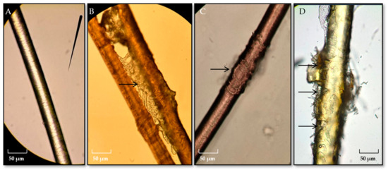 Hair deformation under the influence of Chrysosporium spp. strains: (A)—control, (B)—mycelial growth on the hair surface, (C)—hair cuticle damage, (D)—hair keratinolysis.