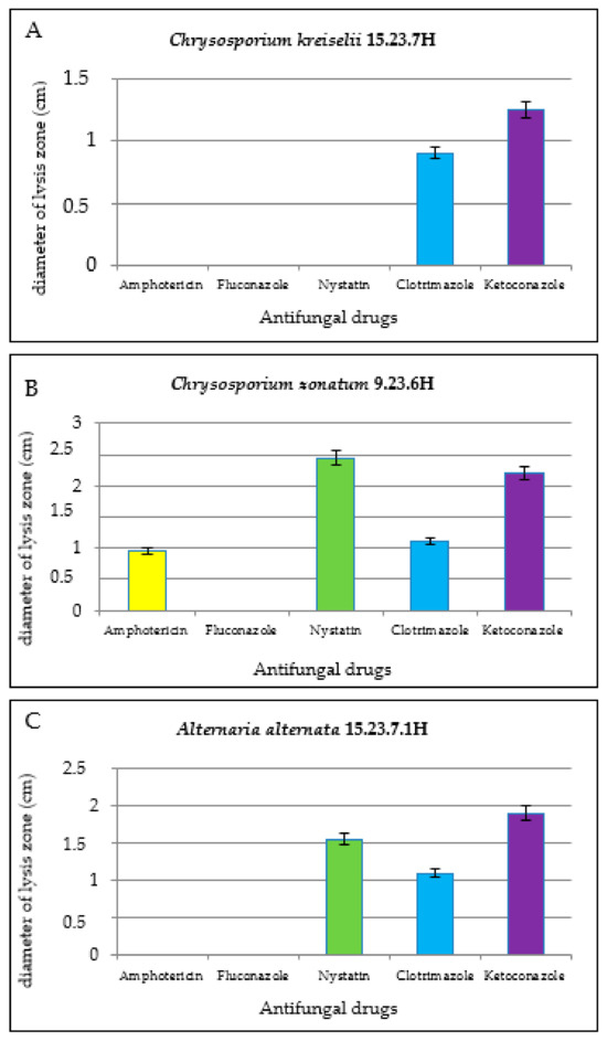 Comparative sensitivity of fungal strains isolated from horses to antifungal drugs: (A)—C. kreiselii strain No. 15.23.7H; (B)—C. zonatum strain No. 9.23.6H; (C)—A. alternata strain No. 15.23.7H.