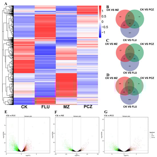 DEGs in A. alternata (AaNEFU1) under different fungicide treatment. (A) Heatmap cluster analysis of up- and downregulated genes per fungicide treatment. (B–D) Venn diagrams of the number of all, upregulated and downregulated DEGs between CK vs. FLU (blue), CK vs. MZ (red), and CK vs. PCZ (green). (E–G) Volcano diagrams of log2 fold changes in DEGs in response to FLU, MZ, and PCZ treatments, respectively. The dots represent genes that were upregulated (red) or downregulated (green).