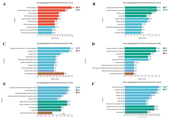 GO enrichment analysis of DEGs under different fungicide treatments. (A,B) The top 10 most significantly up- and downregulated GO categories following FLU treatment. (C,D) The top 10 most significantly up- and downregulated GO categories following MZ treatment. (E,F) The top 10 most significantly up- and downregulated GO categories following PCZ treatment. The length of columns indicates a significant degree of genes enriched in given GO items, and the number inside the parentheses represents the number of enriched genes; BP (red), CC (green), and MF (blue) represent the abbreviations of Biological Process, Cellular Component and Molecular Function, respectively.