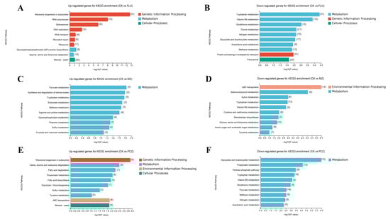 KEGG enrichment analysis of DEGs after treatment with different fungicides. (A,B) The top 10 most significantly upregulated and downregulated categories after FLU treatment. (C,D) The top 10 most significantly upregulated and downregulated categories after MZ treatment. (E,F) The top 10 most significantly upregulated and downregulated categories after PCZ treatment. The length of columns indicates a significant degree of genes enriched in given KEGG pathways, and the number inside the parentheses represents the number of enriched genes; red, green, blue, and yellow stripes represent genetic information processing, Cellular Processes, metabolism, and environmental information processing, respectively.