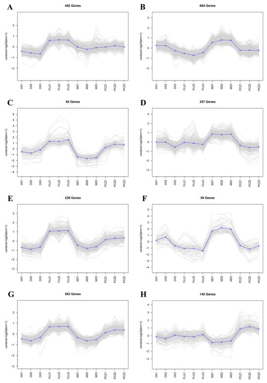 Collinear trend analysis of DEGs after treatment with different fungicides. The gray lines in the background represent the expression trends of individual genes within the cluster, while the blue line indicates the average trend of all genes after normalization. (A) Total of 482 genes with an upregulation trend after treatment with all three fungicides. (C,E,G) Total of 884 genes with an upregulation trend after treatment with FLU and PCZ. (B,D,F) Total of 979 genes with an upregulation trend after treatment with MZ. (H) Total of 145 genes with an upregulation trend after treatment with PCZ.