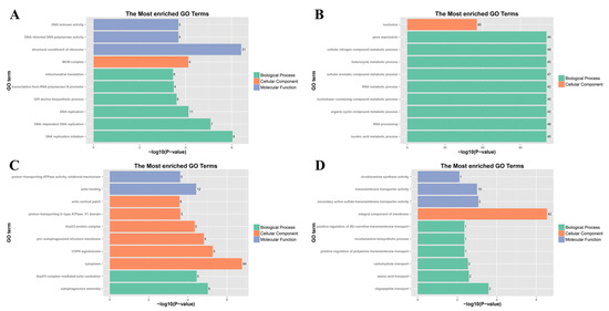 Under FLU treatment, the highest levels of gene expression were noted. Across all three fungicide treatments, 482 genes showed a consistently higher expression pattern, as shown in Figure 4A. GO enrichment analysis of these genes indicated that the top ten enriched categories were primarily associated with ribosomal structure and DNA replication (Figure 5A). It was found that 884 genes had a consistently elevated trend in both the FLU and PCZ treatments, with greater expression levels in the FLU treatment (Figure 4C,E,G). GO enrichment analysis of these genes revealed that the top ten enriched categories were largely associated with nucleic acid metabolism and RNA processing (Figure 5B). On the other hand, 979 genes showed a clear tendency of increased expression only when treated with MZ (Figure 4B,D,F). The top ten most highly enriched categories, according to GO enrichment analysis, were primarily associated with actin and autophagosomes (Figure 5C). Additionally, under PCZ treatment, 145 genes showed a tendency of exclusively enhanced expression (Figure 4H). GO enrichment analysis revealed that the top ten most significantly enriched categories were primarily associated with transmembrane transport of different substances and the biosynthesis of nicotinamide correlation (Figure 5D).
