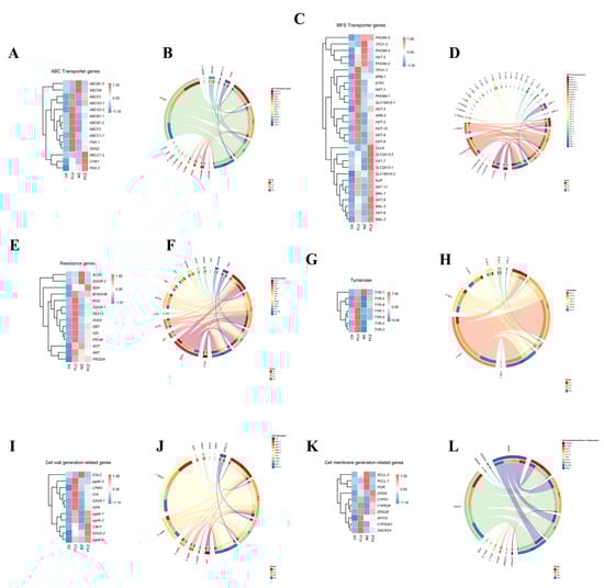 Analysis of 88 upregulated DEGs related to fungal resistance identified based on annotations from the KEGG database and previous research findings. (A,B) Heatmap cluster and chord diagram analysis of upregulated genes of ABC transporter genes under each fungicide treatment. (C,D) Heatmap cluster and chord diagram analysis of upregulated genes of MFS transporter genes under each fungicide treatment. (E,F) Heatmap cluster and chord diagram analysis of upregulated genes of resistance genes under each fungicide treatment. (G,H) Heatmap cluster and chord diagram analysis of upregulated genes of tyrosinase genes under each fungicide treatment. (I,J) Heatmap cluster and chord diagram analysis of upregulated genes of cell wall biosynthesis-related genes under each fungicide treatment. (K,L) Heatmap cluster and chord diagram analysis of upregulated genes of cell membrane biosynthesis-related genes under each fungicide treatment.