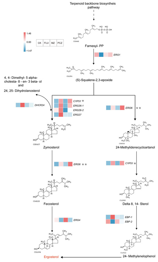 Many studies have demonstrated the strong correlation between fungicide resistance and the underlying resistance mechanisms and ergosterol, a significant component of fungal cell membranes. The ergosterol biosynthesis pathway under three fungicide treatments was thoroughly analyzed based on the expression patterns of DEGs in the steroid biosynthesis pathway (ko00100) of the KEGG database (Figure 8). Six DEGs were elevated after FLU therapy, three DEGs after PCZ treatment, and no DEGs after MZ treatment in relation to ergosterol synthesis. The DEG expression profiles linked to the synthesis of ergosterol were used to identify two biosynthetic pathways.