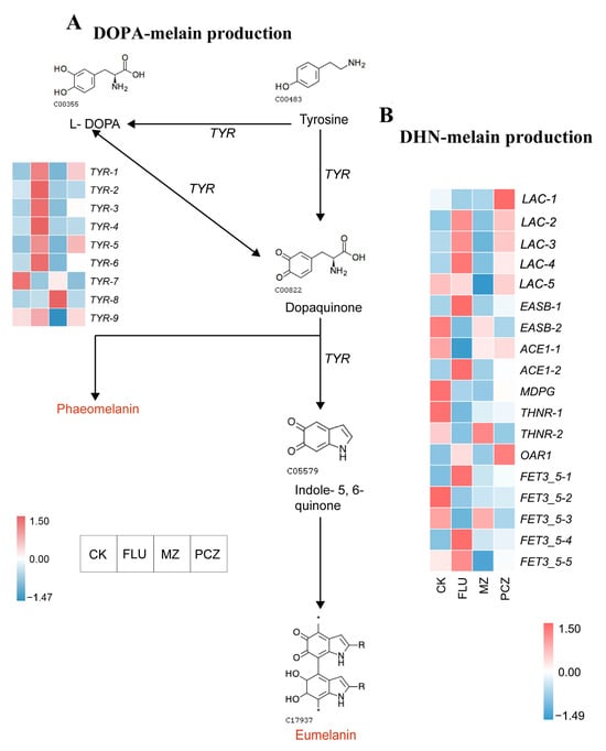 Melanin biosynthesis pathway and DEG changes in AaNEFU1. (A) DOPA melanin biosynthetic pathway. The direction of the arrows indicates the melanin synthesis direction. The heatmaps shown beside arrows denote the expression of the relevant DEGs in the different fungicide treatments, with the color related to the level of gene expression. (B) Heatmap for expression of DEGs involved in the DHN melanin biosynthesis pathway.