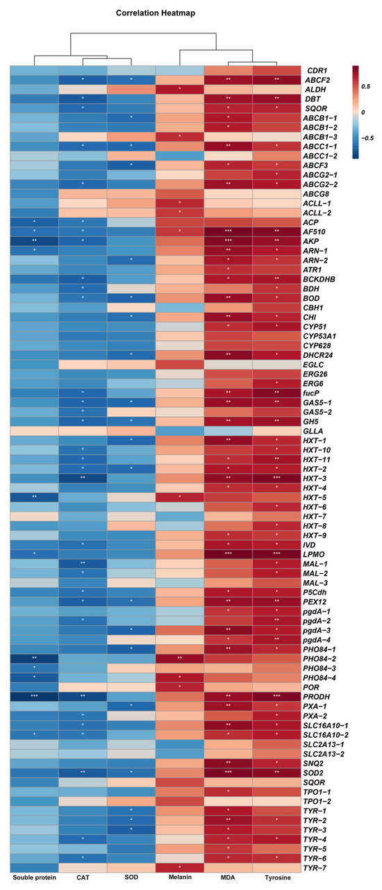 The physiological indicators of A. alternata were measured, and it was shown that the CK group had a greater soluble protein content than any other fungicide treatment group, with the MZ treatment group having the lowest levels (Table 8). MDA content, melanin content, and tyrosinase activity all showed a similar trend, with the FLU treatment group having the highest values and all fungicide treatments having greater levels than the CK group. CAT and SOD activity, on the other hand, were highest in the CK group and lowest in the FLU treatment group. The FPKM of fungicide resistance-related DEGs and the FPKM of the physiological indicators mentioned above were analyzed using the Pearson analysis method. The results showed that melanin content, MDA content, and tyrosinase activity were positively correlated with the majority of fungicide resistance-related DEGs. In contrast, soluble protein content, SOD activity, and CAT activity were negatively correlated with the majority of resistance-related DEGs (Figure 10). These findings are consistent with the trends reflected by the physiological indices.