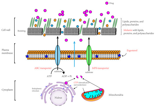 Fungi have additional mechanisms that contribute to drug resistance development in addition to these two well-studied types of multidrug transport proteins. Drug resistance caused by alterations in ERG11/CYP51 (the target of azole fungicides) brought on by demethylation inhibitors (DMIs), such as gene mutations or overexpression, has been extensively documented. Studies have shown that ERG11 upregulation is frequently linked to azole resistance in Candida albicans. Transcriptomic profiling of azole-resistant fungal strains has revealed differential expression of ERG-related genes and regulatory pathways, providing insights into resistance mechanisms in species such as Cercosporidium personatum and Candida spp. [20,21]. Fungal resistance to azole fungicides is also influenced by partial compensatory and catabolic mechanisms. For example, it has been demonstrated that fungal drug resistance is increased by mutations in ERG3, which encodes sterol D5,6-desaturase [22]. The cellular architecture of fungi is also essential for their fungicide resistance mechanisms. Fungal resistance is largely caused by ergosterol, chitin, and melanin, which are essential parts of fungal cell walls and membranes. For example, melanin can protect cells from chemical degradation by being deposited near cell walls, which are cross-linked by various macromolecules, thereby increasing cell strength and stiffness, altering cell permeability and cell swelling [23,24].