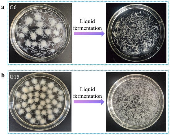 Photos of mycelial morphology of (a) G6 and (b) G15 before and after liquid fermentation.