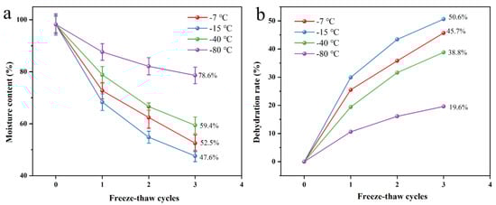 Water content (a) and dehydration rate (b) at −7 °C, −15 °C, −40 °C, −80 °C, respectively, under different freeze-thaw conditions.