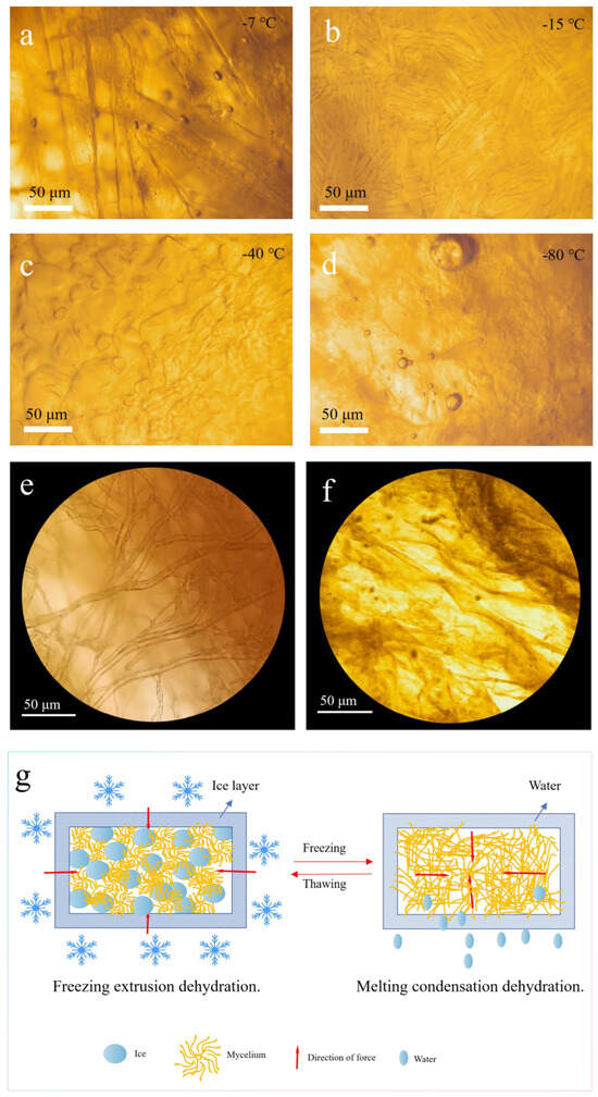 (a–d) Microscopic images of intracellular ice crystals in mycelial membrane under different freeze-thaw conditions; optical microscope images of mycelial morphology (e) before and (f) after freeze-thaw; (g) schematic of dehydration mechanism for mycelial membrane preparation under freeze-thaw conditions.
