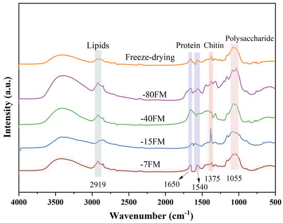 During the freeze-thaw process, ice crystals rupture the cell walls, altering cell permeability. As water is expelled, intracellular substances are also released, resulting in changes in the composition of the mycelial membrane at different freeze-thaw temperatures. The chemical composition of the fungal mycelium membrane underwent notable changes across different freeze-thaw treatments, as confirmed by FTIR and TGA analyses. FTIR spectra (Figure 6) revealed distinct variations in the functional group distribution of the membranes, providing insight into the impact of freeze-thaw processing on the molecular structure. Key characteristic peaks included the following: 2919 cm−1: associated with the C-H stretching vibrations in lipids []; 1650 cm−1: corresponding to the amide I band, indicative of the α-helix structure in proteins []; 1540 cm−1: related to the amide II band, reflecting the β-sheet configuration of proteins []; 1375 cm−1: attributed to the stretching vibrations of chitin, a primary component of fungal cell walls [,]; 1055 cm−1: corresponding to the C-O stretching vibrations in polysaccharides []. A comparative analysis of these peaks demonstrated that the membranes treated at −15 °C exhibited significantly reduced intensities for lipid- and protein-related bands (2919, 1650, and 1540 cm−1), while the chitin-specific peak at 1375 cm−1 showed a marked increase. This suggests that the freeze-thaw process at −15 °C facilitated lipid and protein displacement and chitin reorganisation within the mycelium. Additionally, the intensity of the polysaccharide peak at 1055 cm−1 decreased, which may be due to the loss of some polysaccharides as water is expelled during the freeze-thaw cycling process.