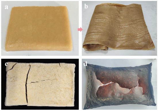 As shown in Figure 7a, after freeze-thaw dehydration the fungal mycelium presents a semi-solid gel-like texture with a smooth and uniform surface. This is due to the formation and melting of ice crystals during the freeze-thaw process, which allows the mycelium to be evenly distributed in the gel-like medium. This method not only offers high dehydration efficiency, but also effectively preserves the continuity and structural integrity of the material due to the mild processing conditions. The mycelial dry membrane (Figure 7b) is obtained by drying the mycelium after freeze-thaw dehydration. The dehydrated mycelial membrane exhibits high flexibility and continuity, providing favorable conditions for further mechanical processing. In contrast, the mycelium membrane obtained by freeze-drying (Figure 7c) appears block-like and loose in structure. This is because the freeze-drying process sublimates water under low temperature and pressure conditions, resulting in the formation of a porous structure that weakens the mechanical strength and processing adaptability of the membrane. Additionally, the mycelium membrane treated with high-temperature drying (Figure 7d) shows significant deformation and damage on the surface, and the color becomes darker. This is likely due to the rapid evaporation of water at higher temperatures during the drying process, which may have triggered certain chemical reactions (e.g., the Maillard reaction), thereby disrupting the structural continuity and uniformity of the membrane, making it unsuitable for further processing. Accordingly, the freeze-thaw dehydration method demonstrates clear advantages over conventional drying techniques such as freeze-drying and thermal drying.