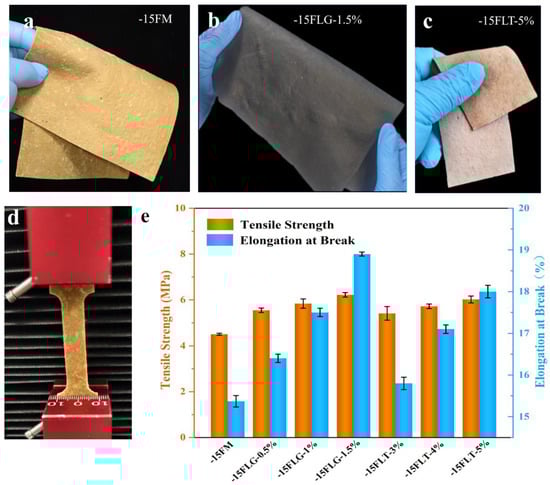 Images of (a) −15 FM, (b) −15FLG-1.5%, and (c) −15FLT-5%; (d) image of tensile strength testing; (e) tensile strength and elongation at break of different materials.