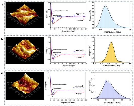 AFM images, force–separation curves, and DMT modulus distributions of (a) −15 FM, (b) −15FLG-1.5%, and (c) −15FLT-5%.