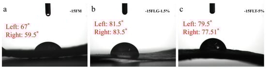 Water contact angles of (a) −15 FM, (b) −15FLG-1.5%, and (c) −15FLT-5%.