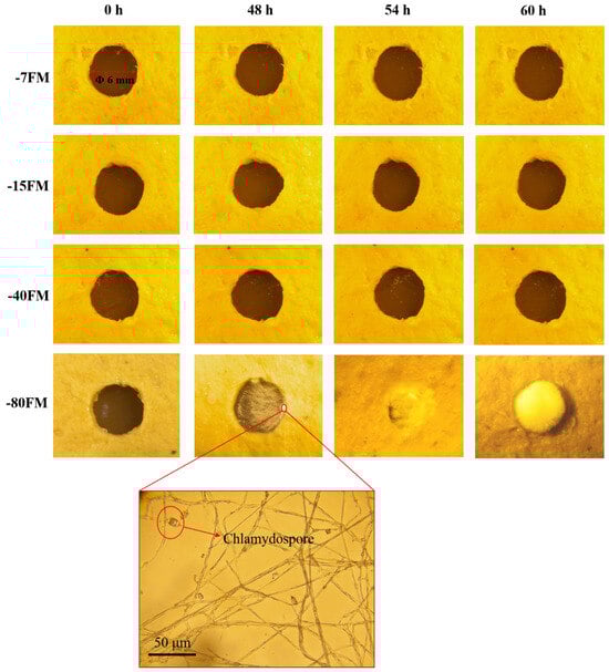 In the self-healing experiments, fungal mycelium leather samples were first cut into specific sizes to simulate potential damage in real-life applications []. The samples were then exposed to standard conditions to mimic typical damage scenarios. After cutting, the samples were placed in a controlled environment with a constant temperature and humidity, and their healing progress was observed at different time intervals. The results demonstrated that under controlled experimental conditions of −7, −15, and −40 °C, no new mycelial growth was detected in the areas exhibiting pore damage (Figure 11). Conversely, after 48 h of exposure to a temperature of −80 °C, new mycelial growth commenced and progressively covered the damaged areas over time (60 h). This observation suggests that the mycelial membrane subjected to freeze-thaw cycles at −80 °C retains a degree of physiological vitality, resulting in minimal cellular damage. However, following three freeze-thaw cycles, there was a significant decline in the vitality of the mycelium. As shown in the bottom image of Figure 11, optical microscopy revealed chlamydospores in the hyphae germinating at the pore edges at −80 °C. This phenomenon may result from the presence of chlamydospores within the interlayers of the mycelial membrane after three freeze-thaw cycles at −80 °C, which have the potential to germinate into new hyphae under favorable conditions (Figure S6). It is hypothesized that this retained physiological vitality is primarily attributable to the presence of chlamydospores situated within the mycelial membrane. Nonetheless, the repaired mycelial membrane exhibited an inadequate amount of mycelium in the intermediate pores, which was insufficient to completely fill the voids created by desiccation. When assessing tensile strength, the samples failed at the pore sites, yielding a measured strength of 1.22 MPa, which represents only one-third of the original tensile performance (Figure S7a,b).