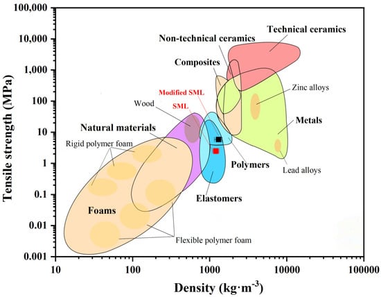 The Ashby plot, a powerful tool for material performance evaluation and comparison, is often used to construct coordinate systems based on key performance parameters []. For fungal mycelium leather, tensile strength and density were selected as the key parameters for the Ashby plot analysis. Figure 12 illustrates the relationship between tensile strength and density, including materials such as natural materials, polymers, composites, and technical ceramics. However, fungal materials are generally unsuitable for construction applications due to their insufficient structural support, as they typically consist of a single component. The −15 FM, −15FLG-1.5%, and −15FLT-5% membranes are categorized as mid-range materials, combining the characteristics of both elastomers and polymers due to their high density and tensile strength.