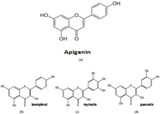 Structural formulae of flavonoid matrices present in M. oleifera: (a) apigenin; (b) kaempferol; (c) myricetin (d) and quercetin [].