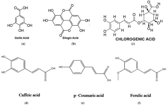 Structural formulae of phenolic acids matrices present in M. oleifera: (a) gallic acid; (b) ellagic acid; (c) chlorogenic acid; (d) caffeic acid; (e) p-coumaric acid; (f) ferulic acid [].