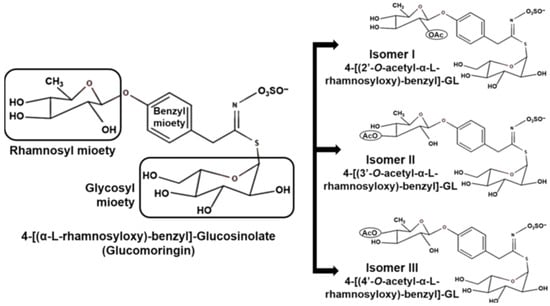 Characteristic glucosinolates of Moringa oleifera tree: 4-[(α-L-rhamnosyloxy)-benzyl]-glucosinolate, commonly known as glucomoringin, and its three isomers. Circles in the isomers indicate acetylation [].