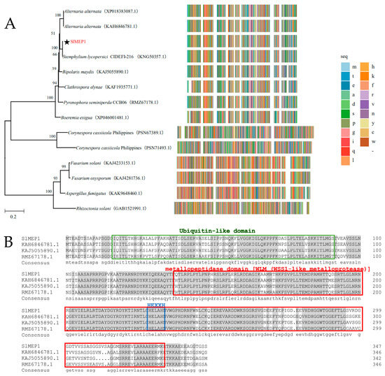 Multiple alignments were determined using the DNAMAN 6.0 software (Lynnon Biosoft, San Ramon, CA, USA), and a neighbor-joining (NJ) tree was constructed with 1000 bootstrap replicates using MEGA (version 7.0, MEGA Inc., Memphis, TN, USA) [26] based on the multiple sequence alignments of the zinc MEP encoding sequence of S. lycopersici (CIDEFI-216 and SL1216) and 12 zinc MEPs of other fungi downloaded from the NCBI database. A homology alignment (http://pfam.xfam.org/, accessed on 10 February 2025) was performed to predict the functional domains present in four zinc MEPs (Alternaria alternata KAH6846781.1, Pyrenophora seminiperda RMZ67178.1, Bipolaris maydis KAJ5055890.1, and S. lycopersici SlMEP1, PQ898935).