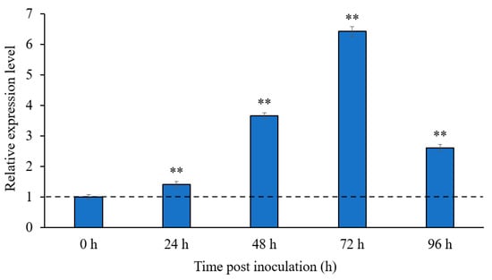 Transcriptional levels of the SlMEP1 gene of S. lycopersici during the fungal invasion to tomato leaves. Error bars were calculated based on three replicates, and the asterisks ** indicate a significant difference (t-test; p < 0.01) between the transcriptional level of the S. lycopersici-inoculated samples and in vitro S. lycopersici hypha.