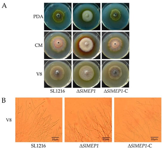To study the effect of SlMEP1 on the fungal growth and nutrient utilization, the strains of SL1216, ΔSlMEP1, and ΔSlMEP1-C were cultured separately on the PDA, CMA, and V8 plates (Figure 3A). Five days after incubation, the ∆SlMEP1 strain showed significant differences in the pigment production and mycelial density compared to those of the SL1216 and ∆SlMEP1-C strains on all three medium plates, except that of the mycelial growth rate. The microscopic observation of mycelia grown on the V8 plates revealed that ∆SlMEP1 hypha were unable to branch as normally as those of the SL1216 or ∆SlMEP1-C strains. Some forked branches at the tip of ∆SlMEP1 hypha on the V8 plates were noticed (Figure 3B).