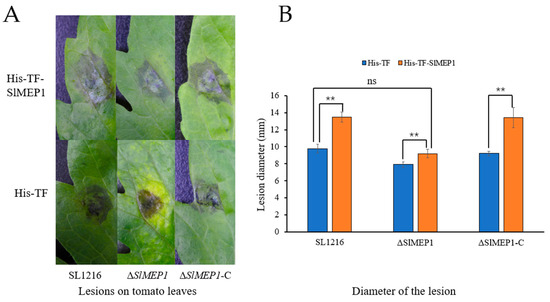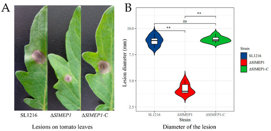 Comparison of lesion sizes induced by three S. lycopersici strains, ∆SlMEP1, SL1216, and ∆SlMEP1-C. (A) Lesion size and appearance on tomato leaves inoculated with three different strains for 6 days. (B) Statistical comparison of lesion diameters (mm) on tomato leaves after inoculation. Asterisks ** indicate a significant difference (p < 0.01, t-test, n = 9) between each of three strains (ns = not significant).