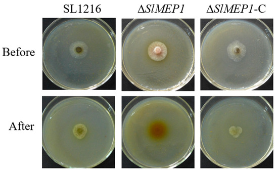 Comparison of three S. lycopersici strains, ∆SlMEP1, SL1216, and ∆SlMEP1-C, grown on the cellophane-membrane-covered V8 agar plates for 36 h first (Before) and then for another 48 h after the removal of the membrane (After), showing that the SlMEP1-deleted ∆SlMEP1 strain was unable to penetrate the cellophane membrane.