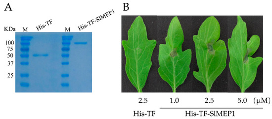 Three days after inoculating the purified His-TF-SlMEP1 protein into leaves of the susceptible tomato cultivar “Jinpeng No. 1” at a concentration of 1.0, 2.5, or 5.0 µM, respectively, the His-TF-SlMEP1-inoculated spots clearly expressed a sign of cell collapse/necrosis, while the His-TF-infiltrated leaves as the control (CK) did not (Figure 6B). The necrotic size of the His-TF-SlMEP1-inoculated spots enlarged along with the increase in the His-TF-SlMEP1 concentration.