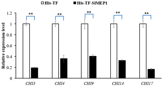 The RT-qPCR detection of chitinase Chit3, Chit4, Chit9, Chit14, and Chit17 in the His-TF-SlMEP1 or in the His-TF-inoculated tomato leaves indicated that the transcript levels of all of these five chitinase-encoding genes were significantly reduced in the tomato leaves infiltrated with His-TF-SlMEP1, compared with the control leaves infiltrated with His-TF (Figure 8), suggesting that the SlMEP1 protein inhibited the expression of all chitinases tested.