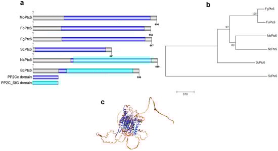 Figure 1. Domain structure and phylogenetics of MoPtc6 and its orthologs. (a) The domain architecture of Ptc6 proteins from different fungi (PP2Cs domain and PP2C_SIG domain). The architecture was built using IBS software (IBS.biocuckoo.org, accessed on 20 November 2024). (b) Analysis of the phylogenetic relationship of Ptc6 proteins among different pathogenic fungi. The tree was produced by using MEGA X software version 10.1. (c) Three-dimensional structure of MoPtc6 generated from Swiss Model Software https://www.genecards.org/, accessed on 20 November 2024. Mo: Magnaporthe oryzae; Fo: Fusarium oxysporum; Fg: Fusarium gramineurum; Sc: Saccharomyces Cerevisiae; Bc: Botrytis Cinerea. Nc: Neurospora crassa.