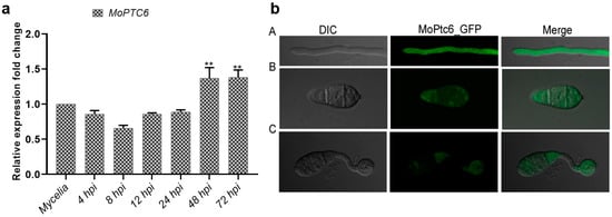 Figure 2. Expression pattern and localization of MoPTC6 in M. oryzae. (a) Transcription patterns of MoPTC6 during interaction with the host; three-week-old rice seedlings were sprayed with Guy11, and the samples were harvested at different time points (4 h, 8 h, 12 h, 24 h, 48 h, and 72 h). (b) Sub-localization of MoPtc6-GFP in the mycelia, conidia, and appressoria. Images were taken by using confocal scanning microscope. (** p < 0.01).