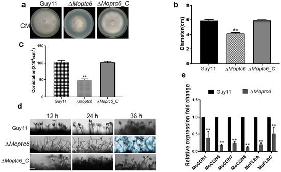 Figure 3. MoPtc6 is important for growth and conidiation in M. oryzae. (a,b) Growth and colony diameters of the mutant and WT grown on solid complete media at 28 °C for ten days. (c,d) Quantification of conidia and conidiophores development in the ∆Moptc6 and WT. (e) Expression levels of conidiation-related genes in ∆Moptc6 compared to the WT. Asterisks show statistically significant differences analyzed by ANOVA (**, p < 0.01). Scale bar = 20 μm.