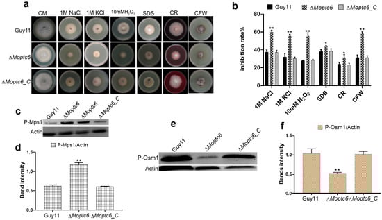 Figure 4. Sensitivity of ∆Moptc6 mutant and WT to various stresses. (a) Growth of the strains on CM media with 200 µg/mL CR, 0.01% SDS, 200 µg/mL CFW, 1 M KCl, 1 M NaCl, and 10 mM H2O2 at 28 °C for ten days. (b) Inhibition of growth of the strains due to the diverse fungal stressors. (c,d) Osm1 phosphorylation levels; MoOsm1 was bound to P38 Thr180/Tyr182 antibody and actin was used as a control. Quantification of band intensity was performed with ImageJ software. (e,f) Mps1 phosphorylation levels; MoMps1 were detected with antiphospho P44/42 antibody, and actin was used as a control. (f) Displayed bands’ intensity in mutant and WT. Asterisks show statistically significant differences (*, p < 0.05; **, p < 0.01).